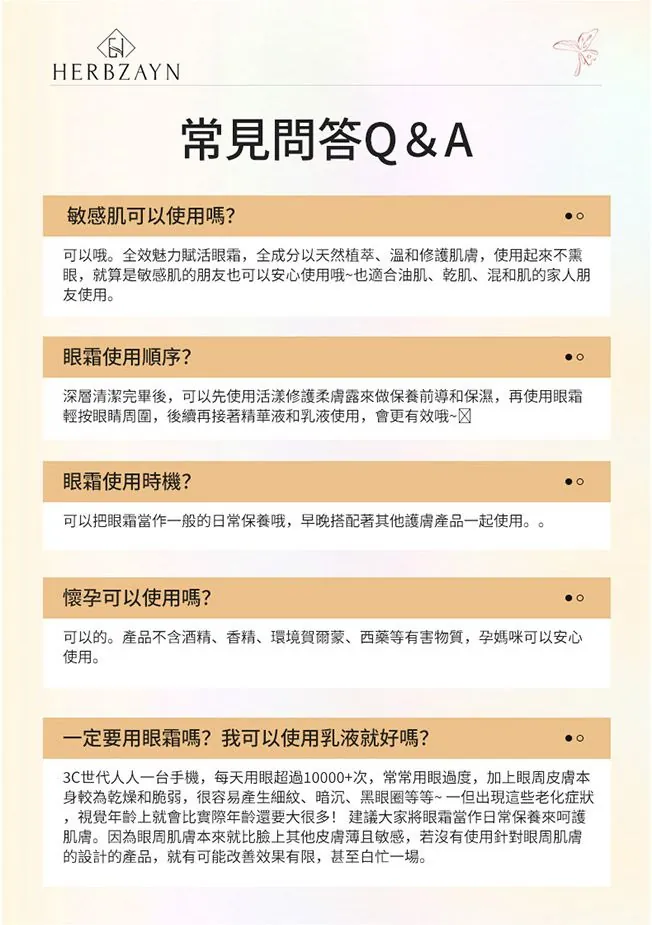 眼部瑕疵橡皮擦, 輕鬆擦去年齡痕跡 1. 抗 · 眼紋 - 抗動靜態紋,緊緻彈嫩 2. 潤 · 眼周 - 注水保濕,提亮彈潤 3. 淡 · 淚溝 - 深層修護,淡化淚溝暗沉 4. 護 · 肌底 - 提升眼周保護力,撫平細紋 5. 促 · 循環 - 促進眼周代謝,改善眼袋熊貓眼 產品不含酒精、環境賀爾蒙、西藥等有害物質,孕媽咪和敏感肌皆可以安心使用