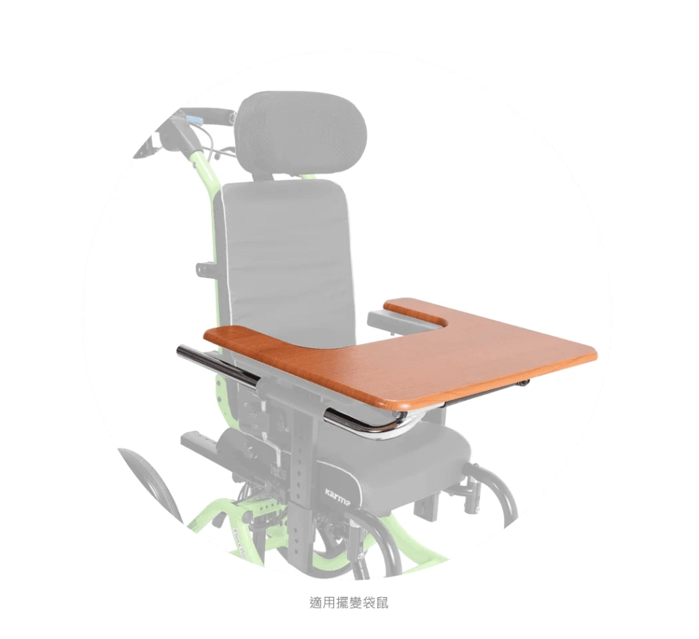 輕巧實用,方便在輪椅上用餐或工作。桌板需要一定的扶手支撐面積,建議長型或寬面的扶手支撐使用。
