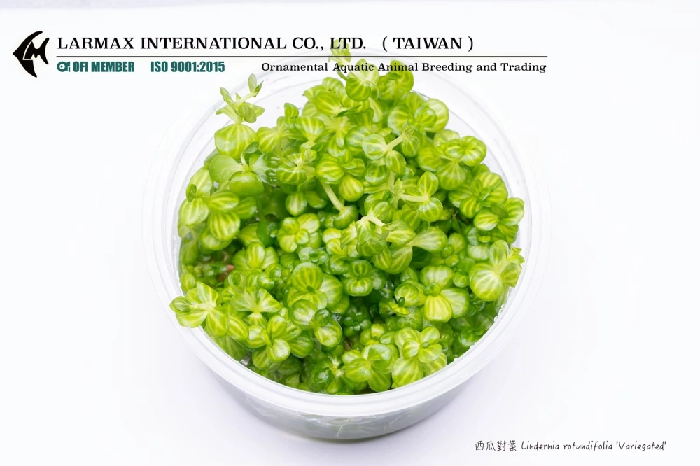 西瓜對葉(學名:Lindernia rotundifolia 'Variegated')是一種極受歡迎的觀賞水草,因葉面上分布有類似西瓜皮的白色條紋而得名。它屬於對生有莖草類,生命力強韌且栽培難度低,非常適合初學者或低維護的水草缸。