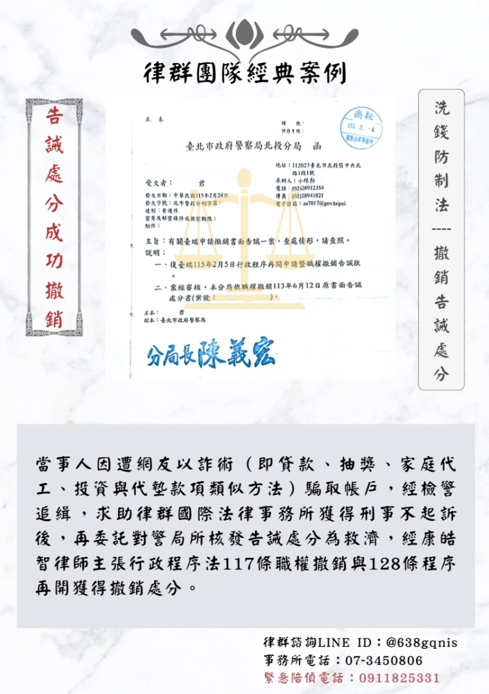 當事人因遭網友以詐術(即貸款、抽獎、家庭代工、投資與代墊款項類似方法)騙取帳戶,經檢警追緝,求助律群國際法律事務所獲得刑事不起訴後,再委託對警局所核發告誡處分為救濟,經康皓智律師主張行政程序法117條職權撤銷與128條程序再開獲得撤銷處分。