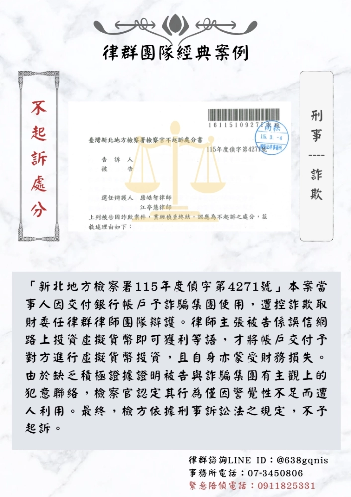 「新北地方檢察署115年度偵字第4271號」本案當事人因交付銀行帳戶予詐騙集團使用,遭控詐欺取財委任律群律師團隊辯護。律師主張被告係誤信網路上投資虛擬貨幣即可獲利等語,才將帳戶交付予對方進行虛擬貨幣投資,且自身亦蒙受財務損失。由於缺乏積極證據證明被告與詐騙集團有主觀上的犯意聯絡,檢察官認定其行為僅因警覺性不足而遭人利用。最終,檢方依據刑事訴訟法之規定,不予起訴。