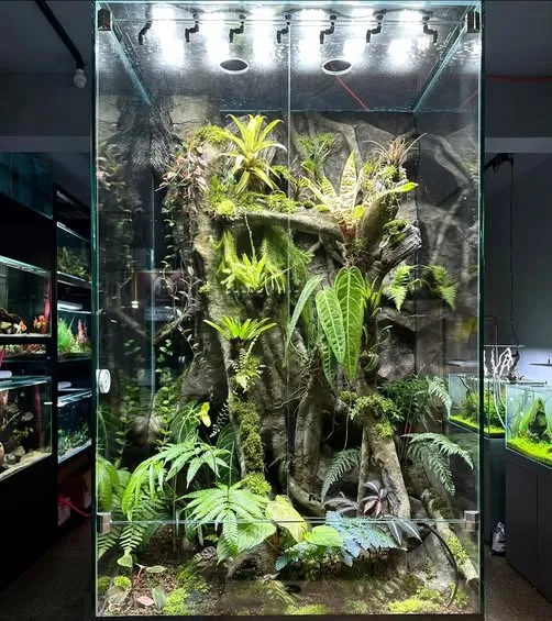 雨林爬蟲缸(Rainforest Vivarium/Terrarium)是一種模擬熱帶雨林環境的生態飼養系統,強調高濕度、良好的通風以及豐富的垂直攀爬空間。