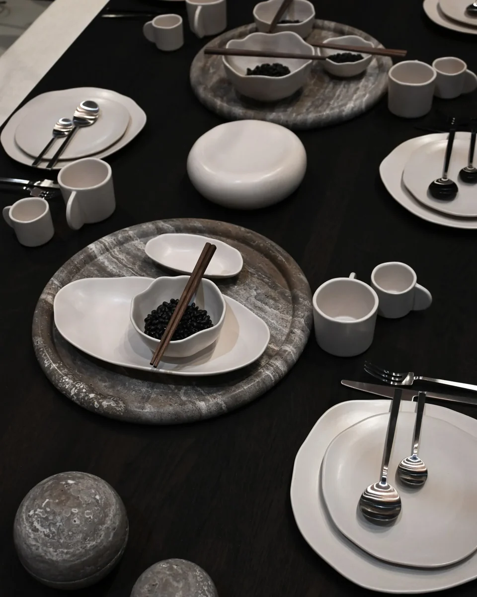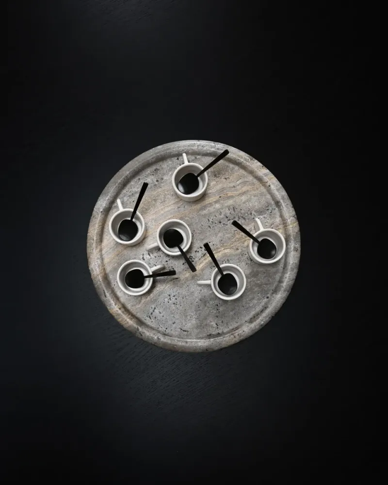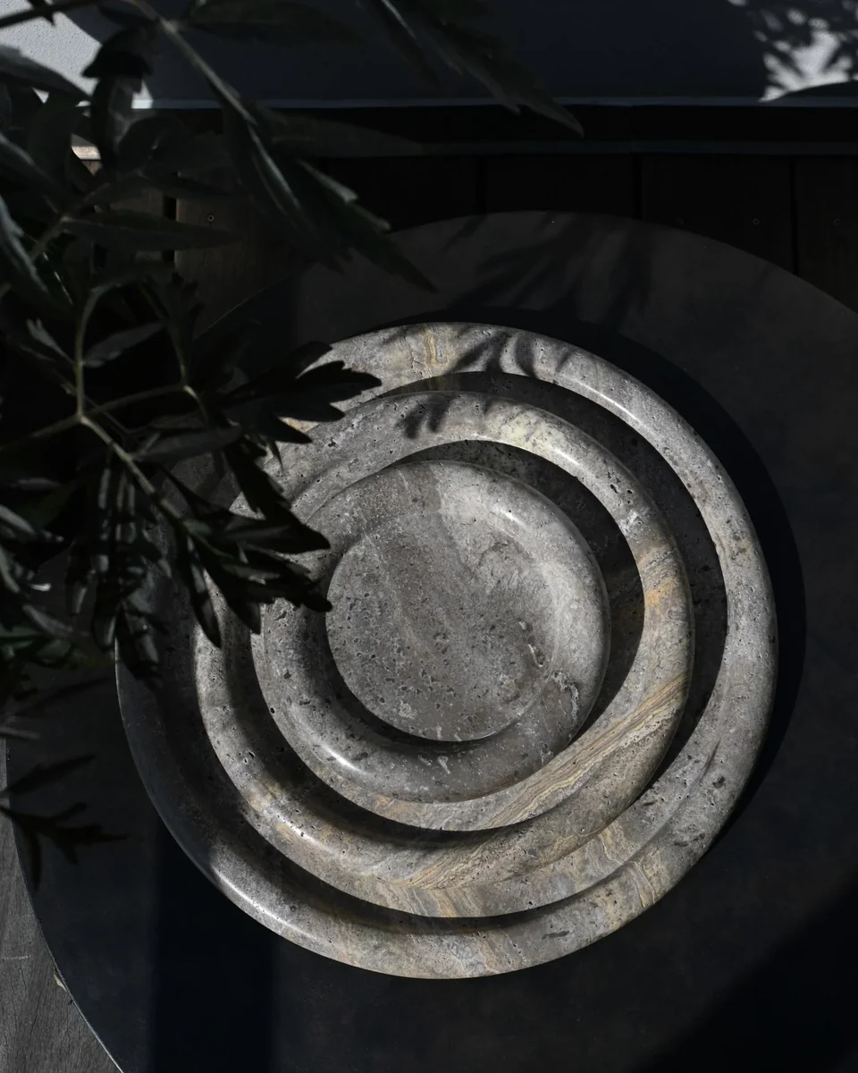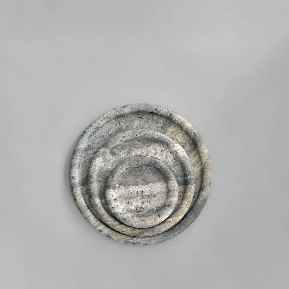 Enkei 系列採用美麗的銀灰洞石製成,包含多種尺寸和形狀的罐子和托盤。幾何形狀與天然石材紋理結合,達到極簡設計與獨特質感的完美平衡,每件作品均獨一無二。