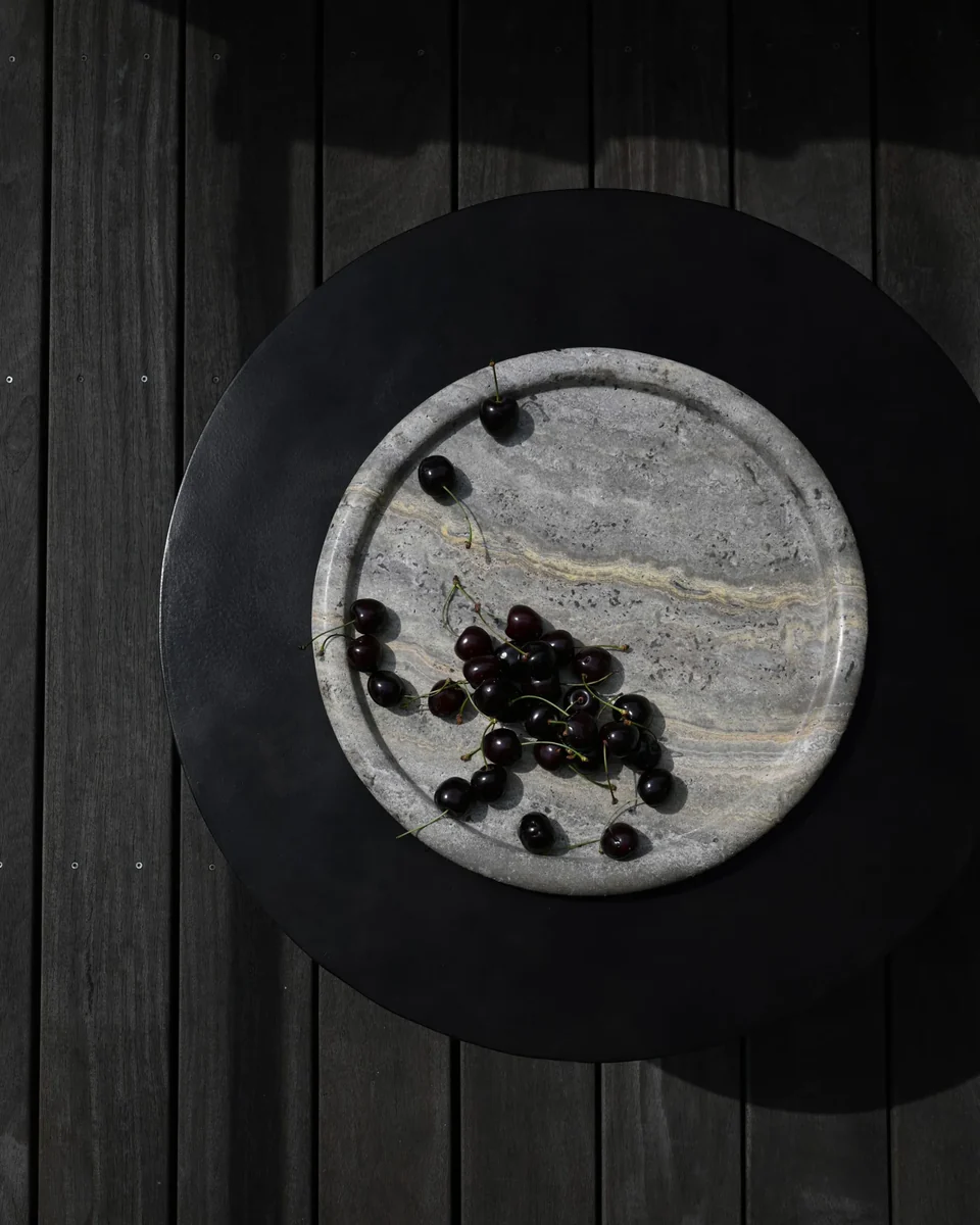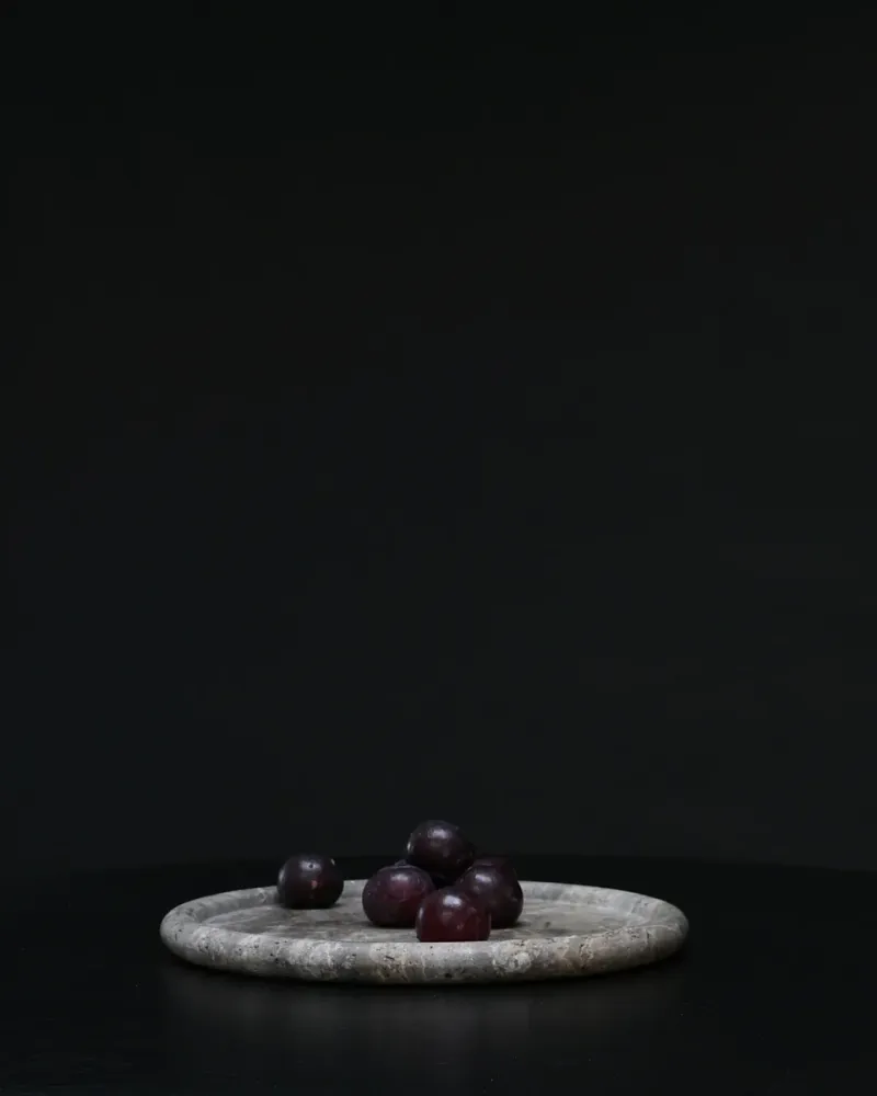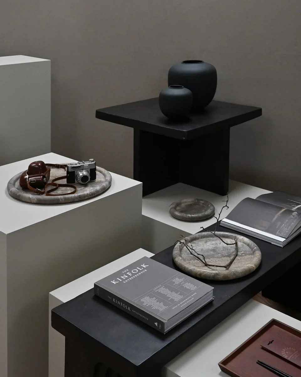 Enkei 系列採用美麗的銀灰洞石製成,包含多種尺寸和形狀的罐子和托盤。幾何形狀與天然石材紋理結合,達到極簡設計與獨特質感的完美平衡,每件作品均獨一無二。