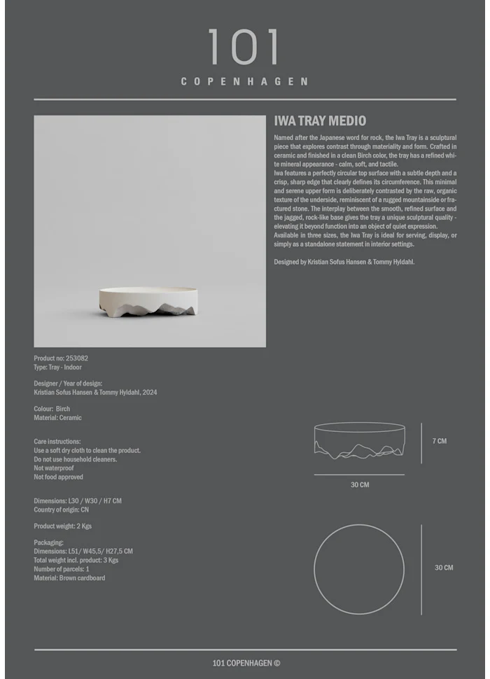 以日文「岩石」命名,Iwa 托盤是一件雕塑般的作品,透過材質與造型的對比來展現美感。它以陶瓷製作,並以純淨的 Birch(樺木色) 完成表面處理,呈現出精緻的白色礦物質感 —— 平靜、柔和且富有觸感。