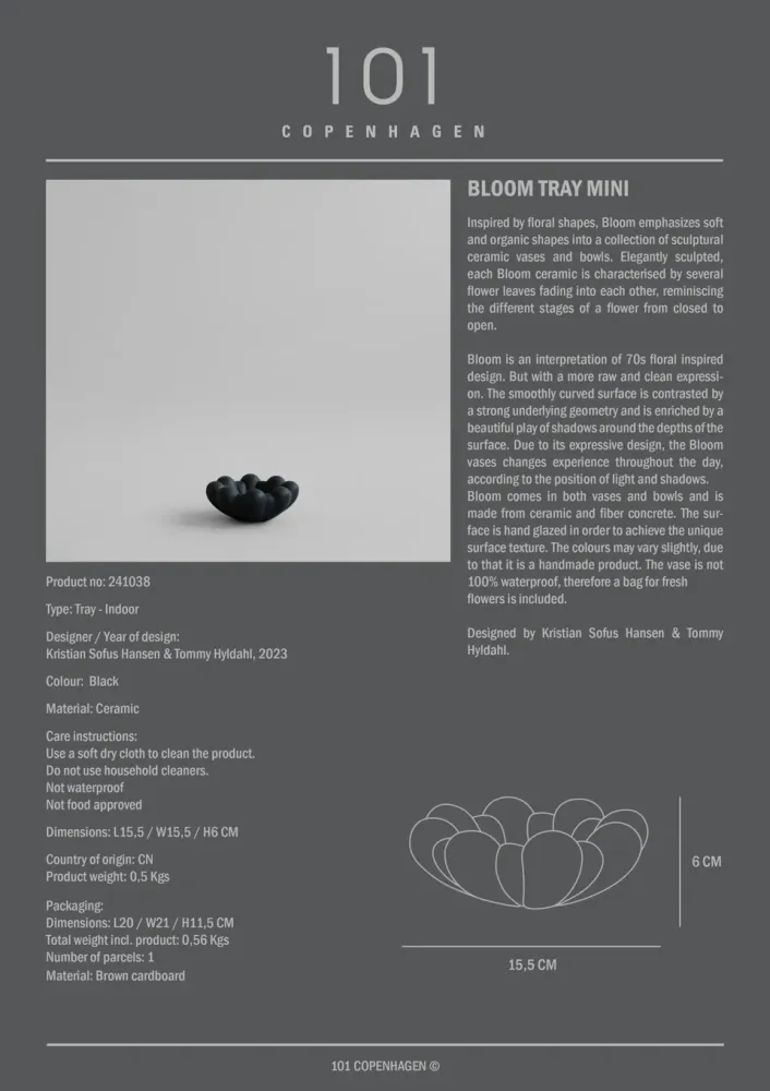 受到花卉形狀的啟發,Bloom 系列強調柔和的有機形狀,將雕塑感的陶瓷花瓶和托盤融入設計。每個作品的設計靈感來自花朵開合的不同階段,其特點是幾片花葉相互褪色,呈現花瓣彼此交融的樣貌。