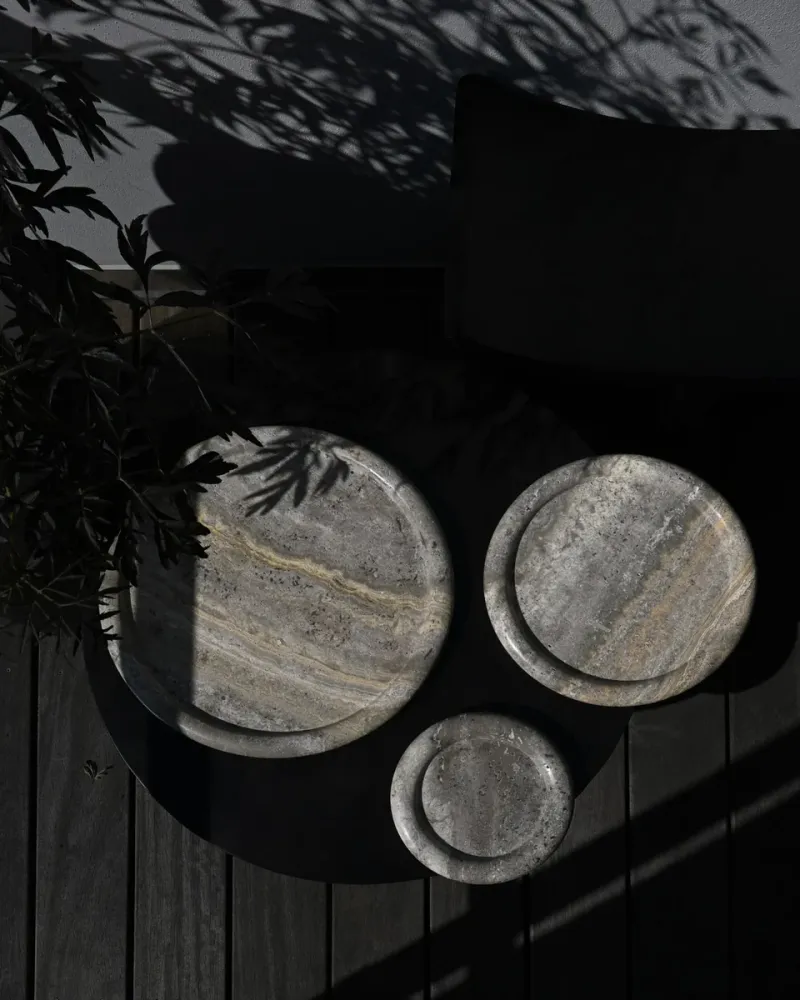 Enkei 系列採用美麗的銀灰洞石製成,包含多種尺寸和形狀的罐子和托盤。幾何形狀與天然石材紋理結合,達到極簡設計與獨特質感的完美平衡,每件作品均獨一無二。