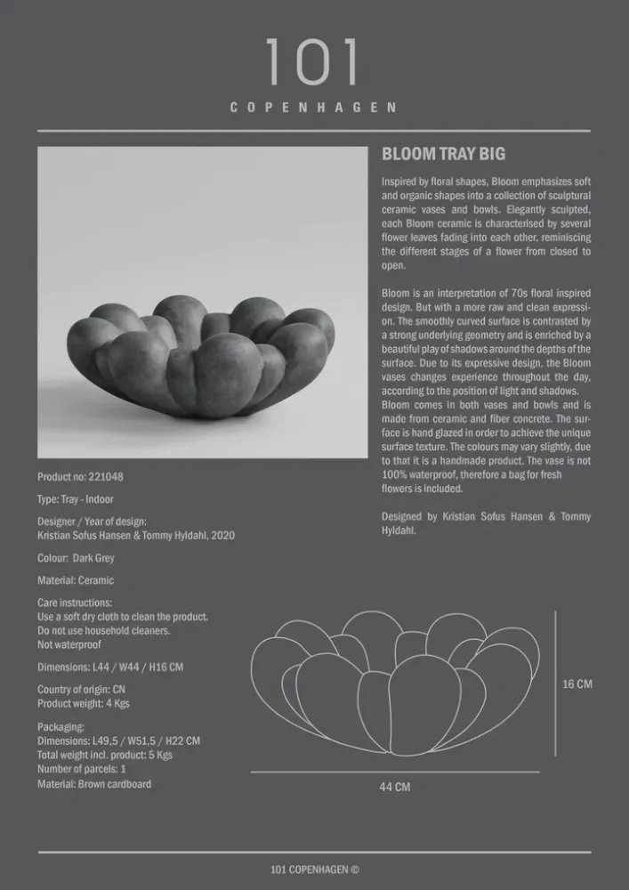 Bloom 有花瓶和托盤兩種形式,由陶瓷和纖維混凝土製成。表面經過手工上釉,呈現獨特的表面紋理。