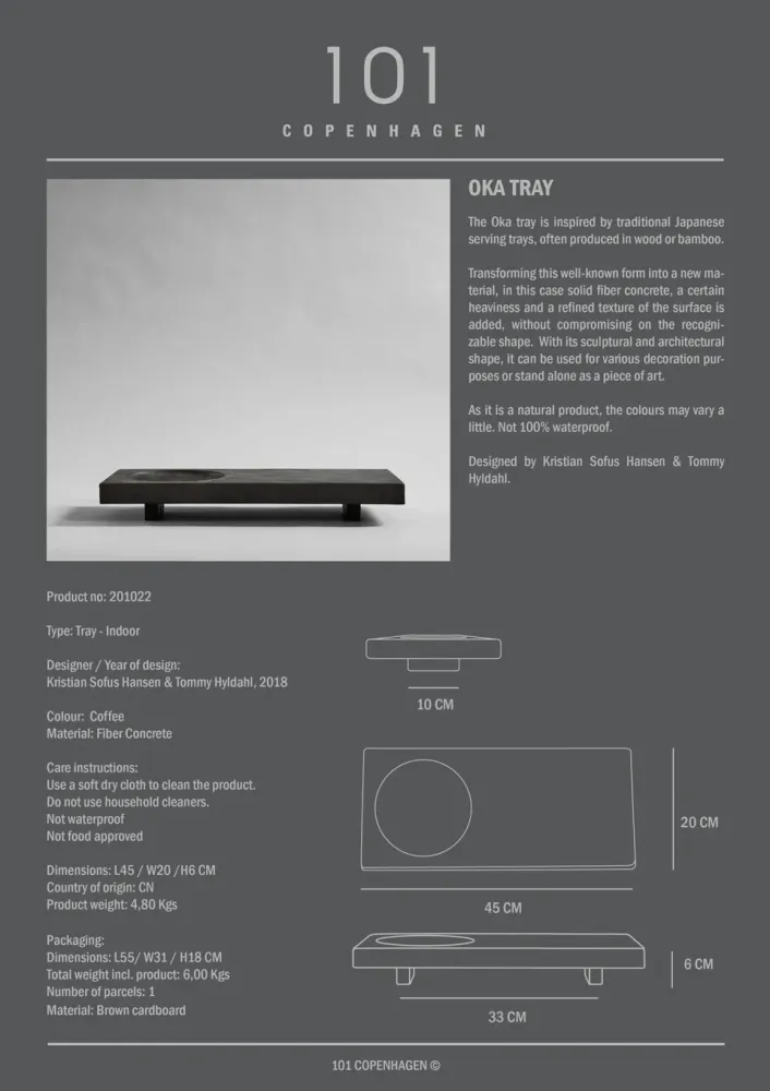 Oka托盤以傳統日式托盤為靈感,通常由木頭或竹子製成。將熟悉的形狀轉換為纖維混凝土材質,增添了質感和重量並保持了經典造型。雕塑般和建築感的外觀,不僅可用於各種裝飾,還可作為藝術品展示。