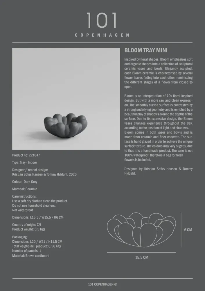 受到花卉形狀的啟發,Bloom 系列強調柔和的有機形狀,將雕塑感的陶瓷花瓶和托盤融入設計。每個作品的設計靈感來自花朵開合的不同階段,其特點是幾片花葉相互褪色,呈現花瓣彼此交融的樣貌。