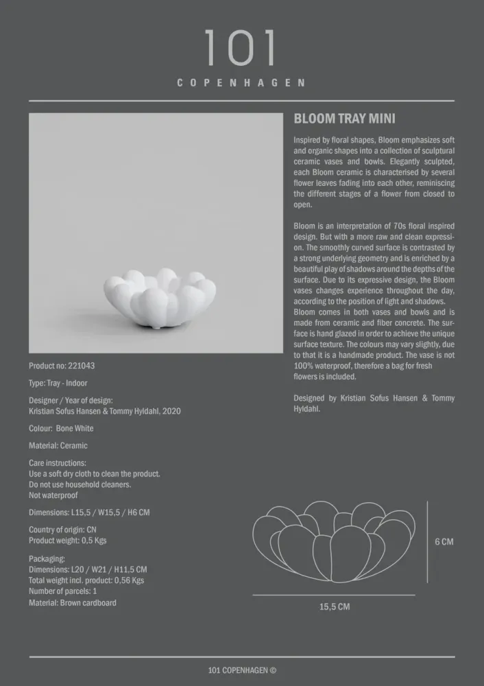受到花卉形狀的啟發,Bloom 系列強調柔和的有機形狀,將雕塑感的陶瓷花瓶和托盤融入設計。每個作品的設計靈感來自花朵開合的不同階段,其特點是幾片花葉相互褪色,呈現花瓣彼此交融的樣貌。