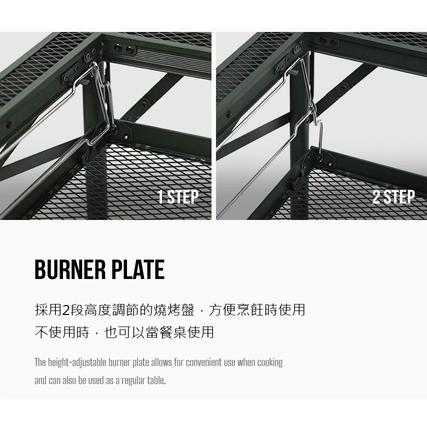 🔹採用2段高度調節的燒烤盤.方便烹飪時使用;不使用時,也可以當餐桌使用
