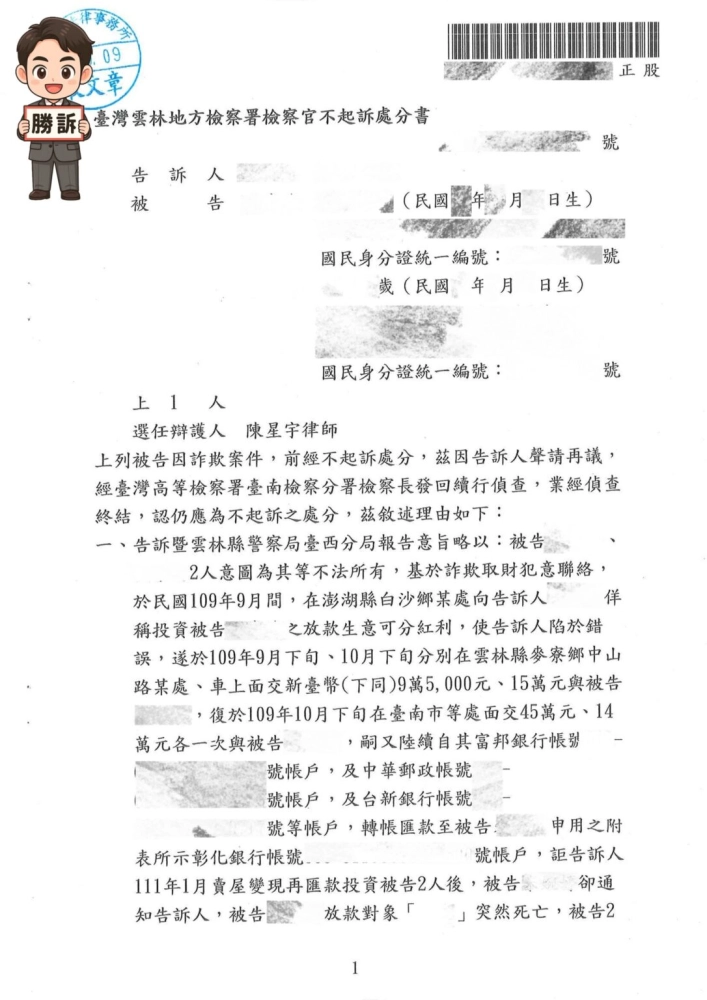 - 釐清「陷於錯誤」的詐欺要件:檢察官在審理時發現,告訴人阿雅在交付金錢前,已明確知悉款項用途是供被告進行放款收息,並預期自己能分得紅利。陳星宇律師據此向檢察官指出,告訴人的行為是基於對投資報酬的期待,而非被被告的「詐術」所騙 。這項論點成功地確立了告訴人並未「陷於錯誤」,從而排除了詐欺罪的核心構成要件 。