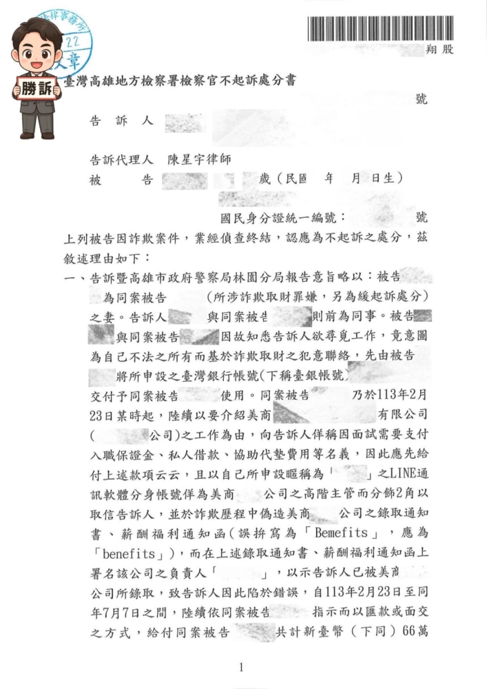 商品【刑事勝訴案例】投資糾紛被控加重詐欺,律師協助辯護獲不起訴處分