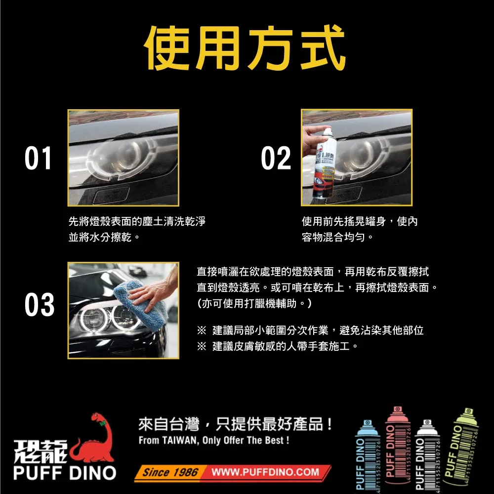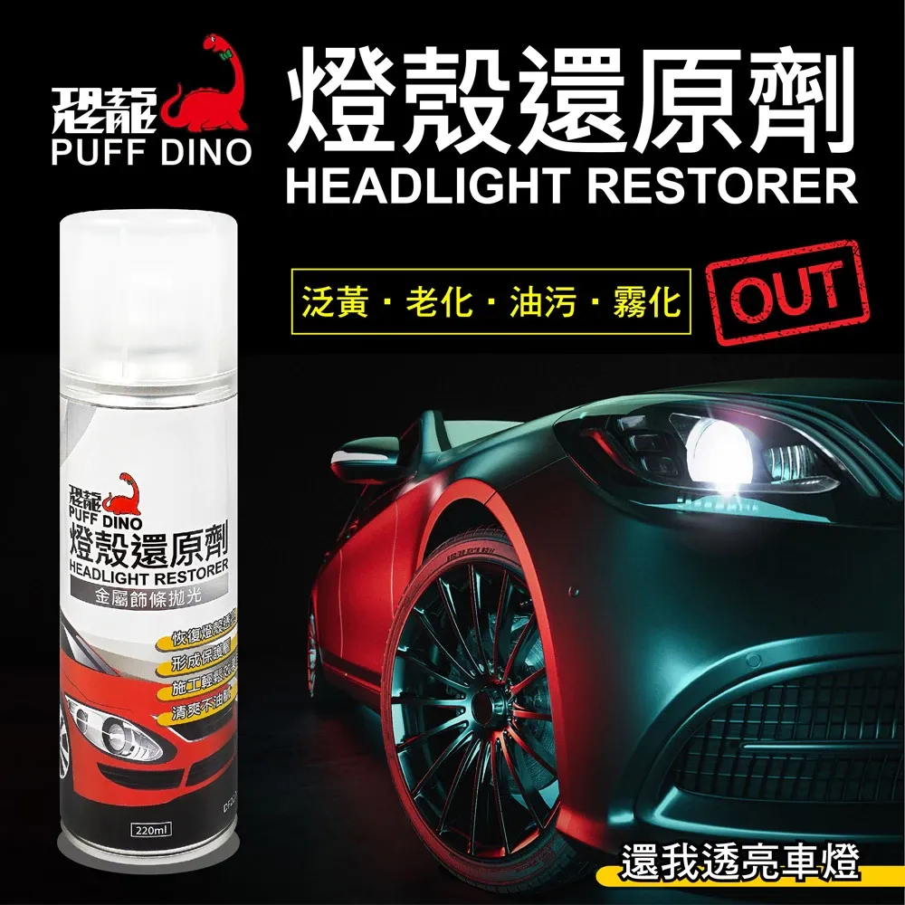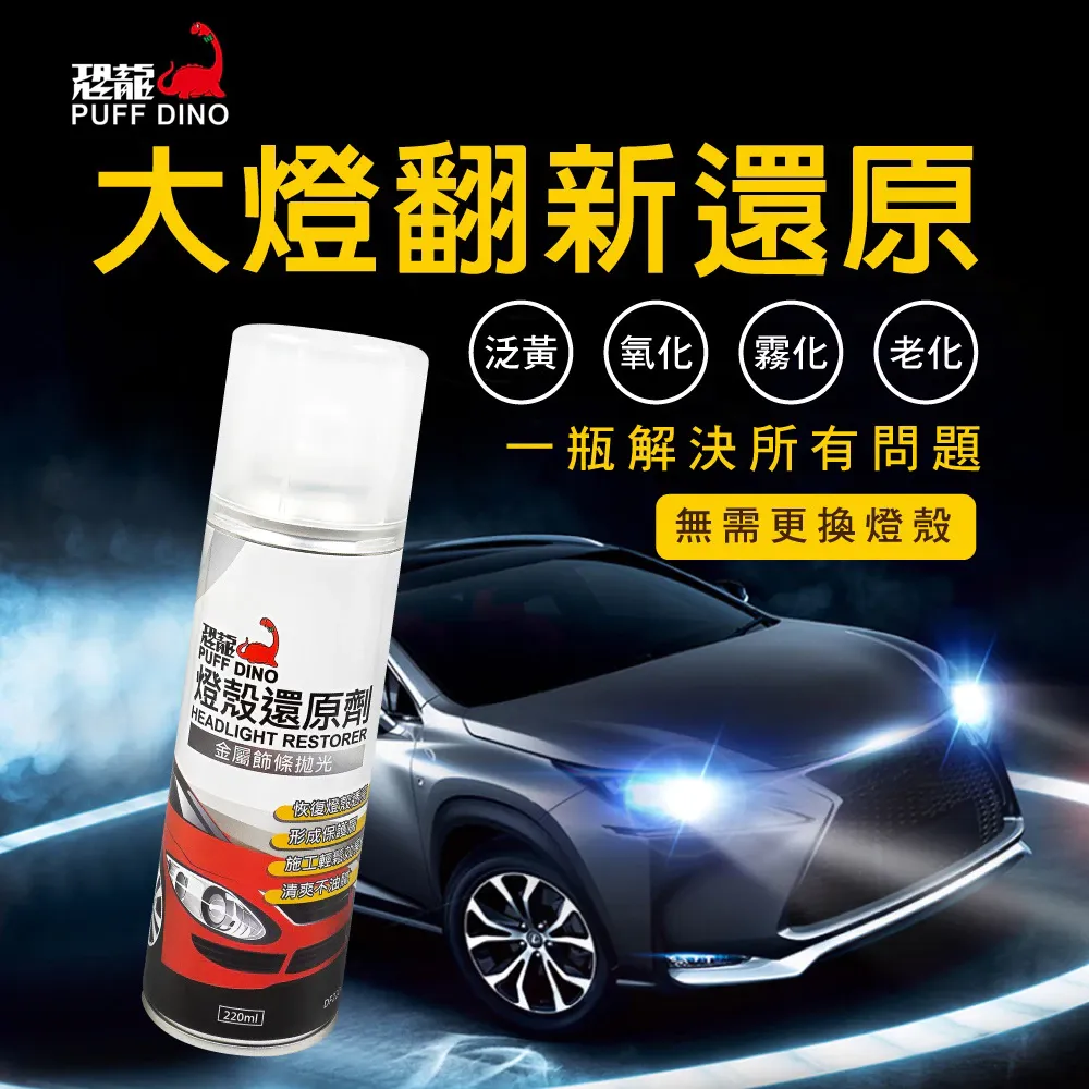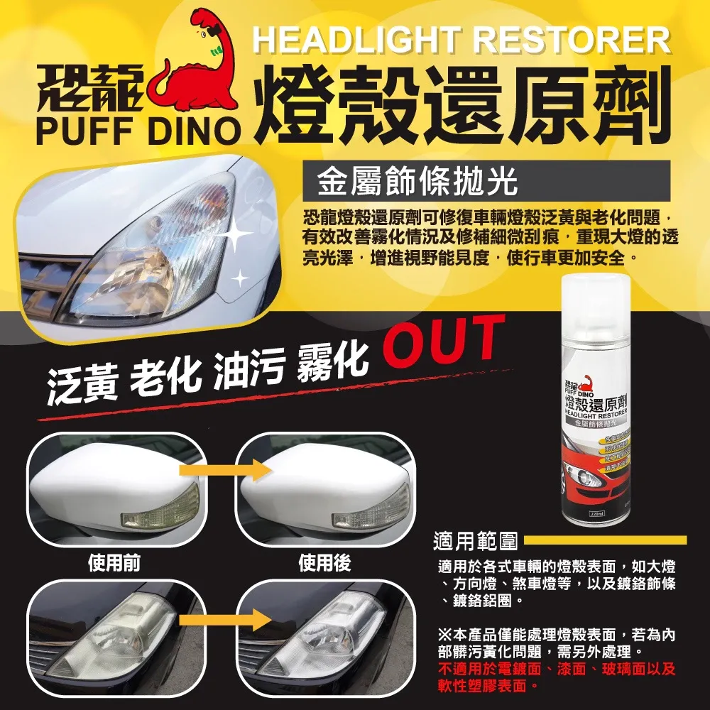 恐龍燈殼還原劑可修復車輛燈殼泛黃與老化問題,有效改善霧化情況及修補細微刮痕,重現大燈的透亮光澤,增進視野能見度,使行車更加安全。