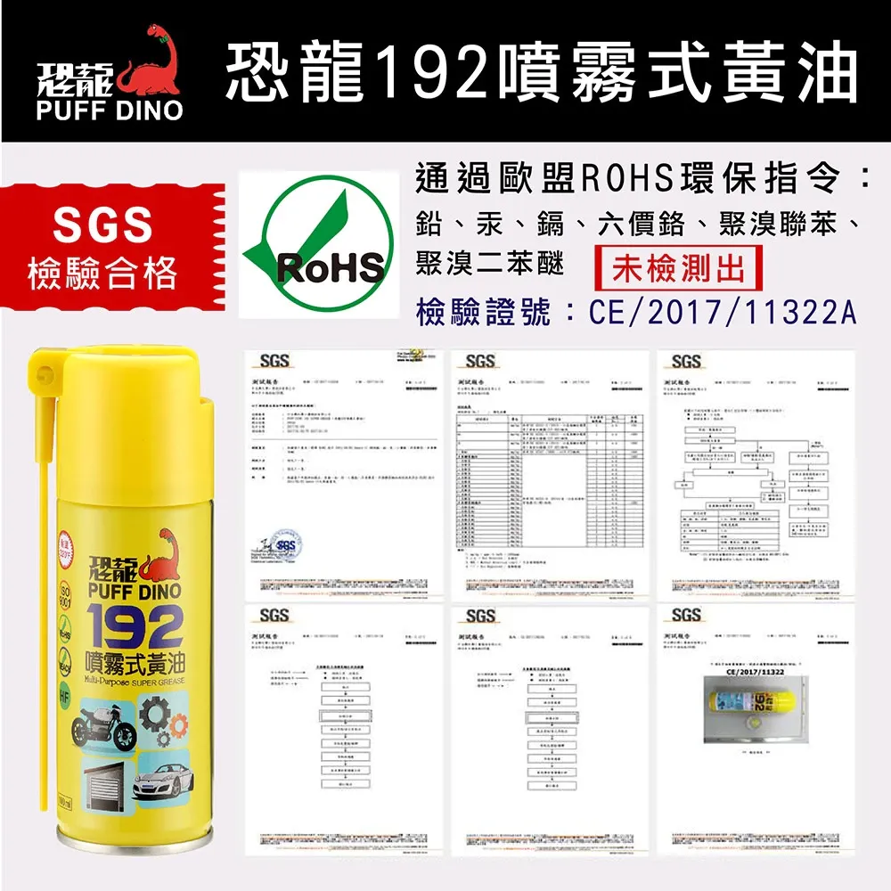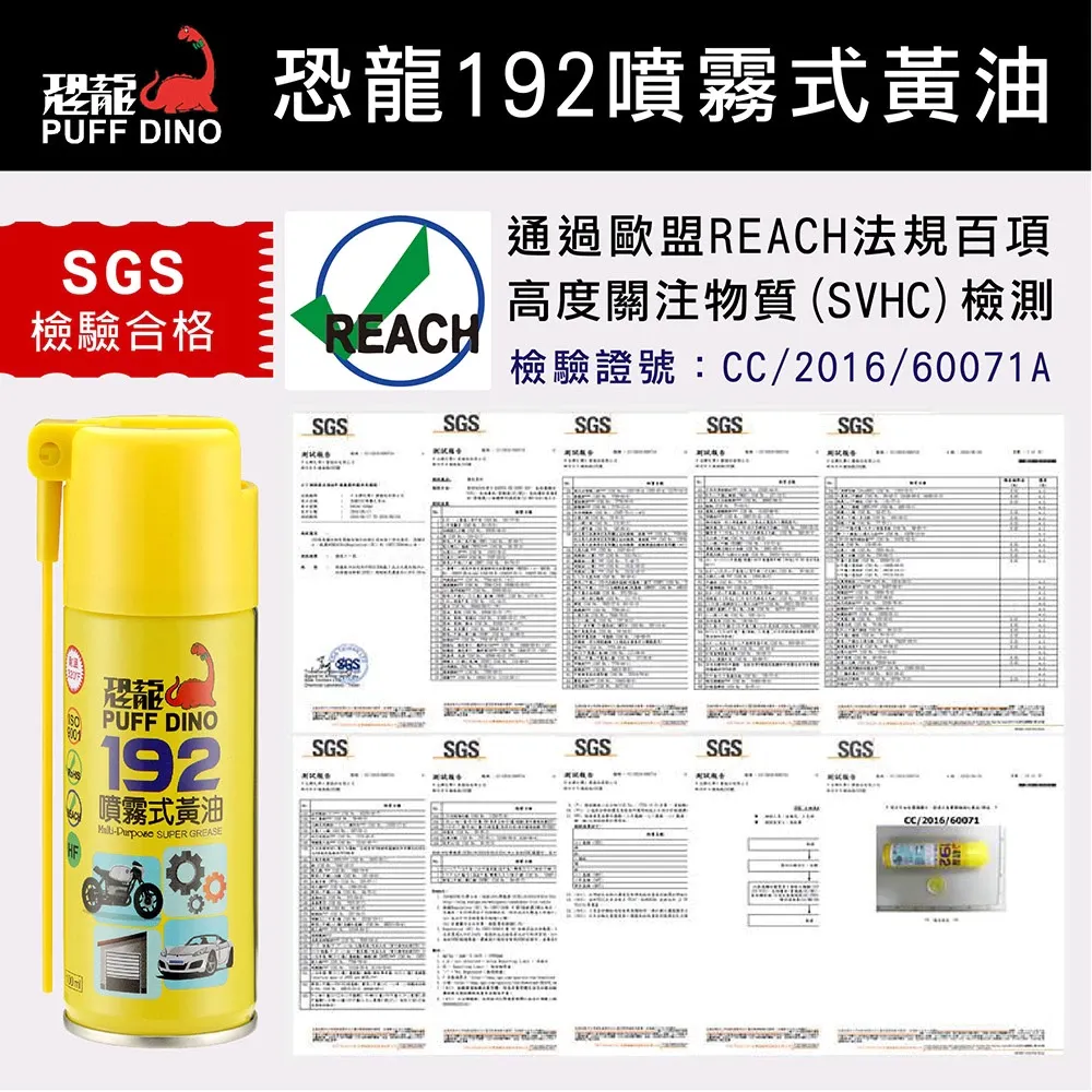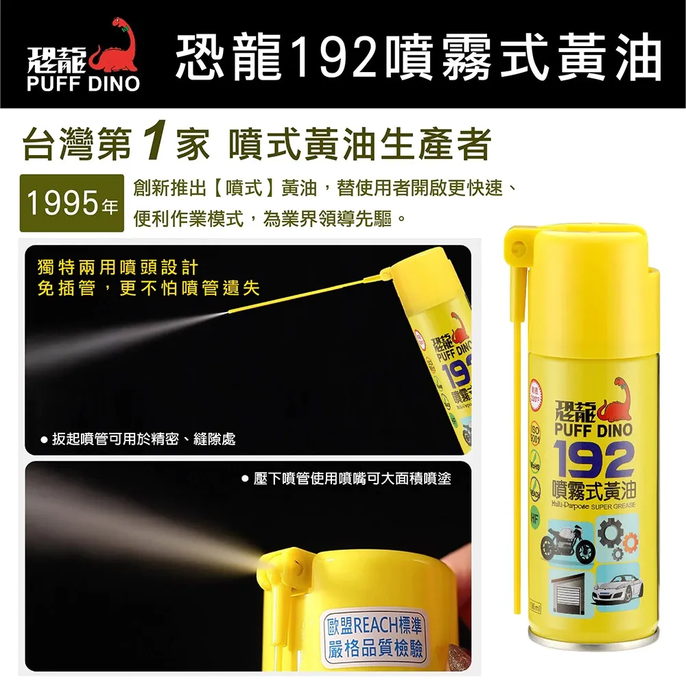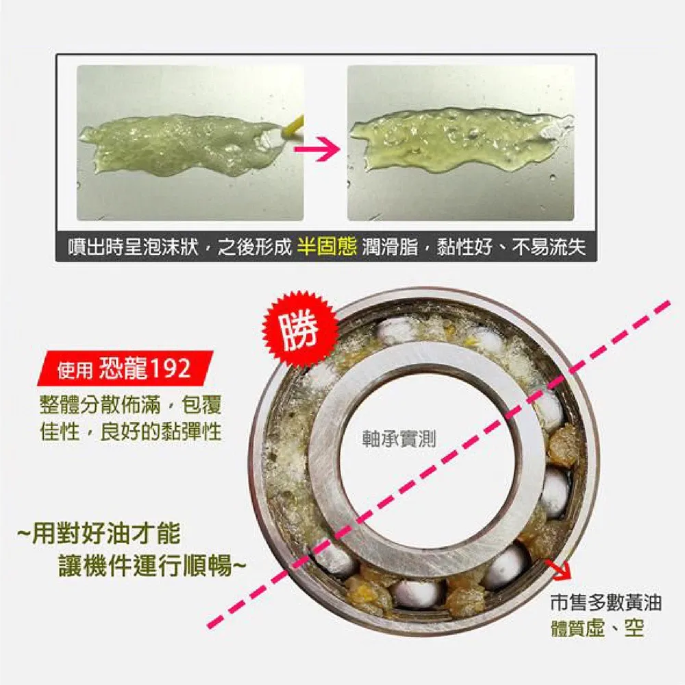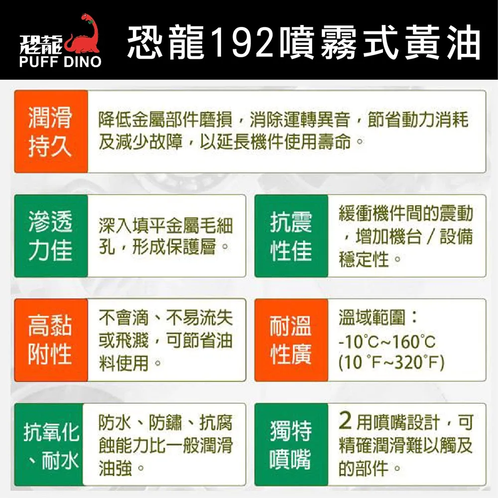 恐龍192具優越的潤滑、防鏽功能,除了耐熱耐壓,更能長期潤滑滲透,不論使用於何種金屬器具,均可發揮最佳的潤滑保護效果。