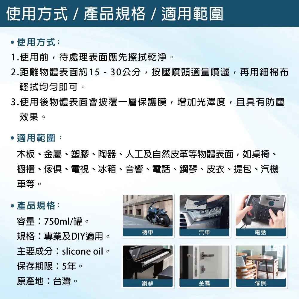 ◆使用後物體表面會披覆一層保護膜,增加光澤度,且具有防塵效果。