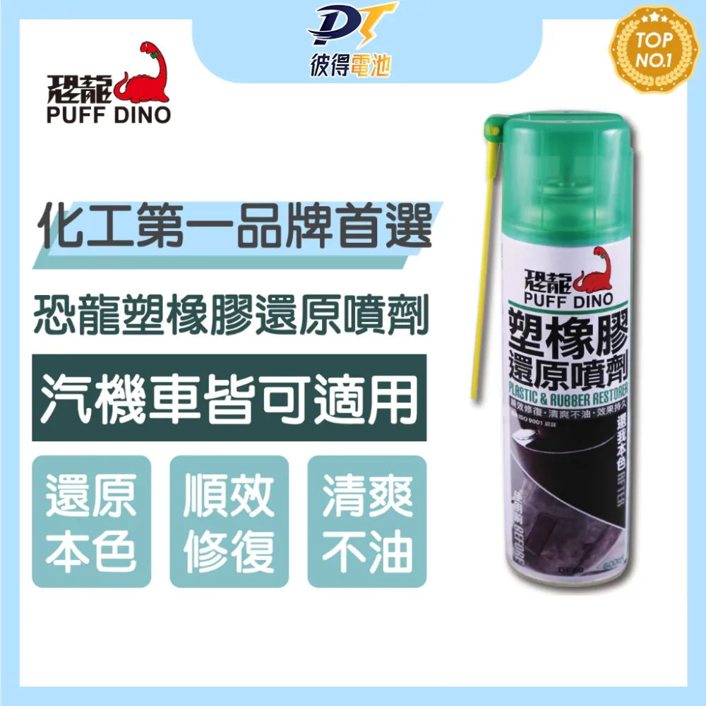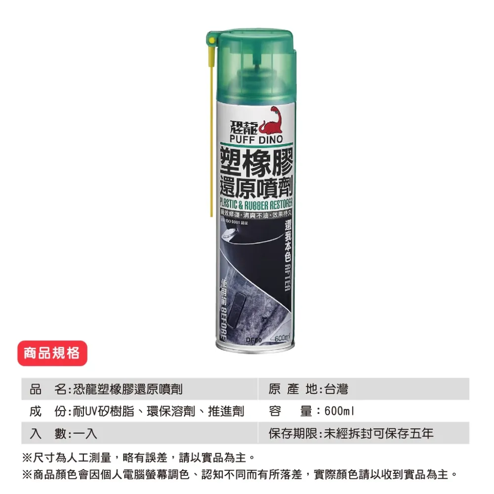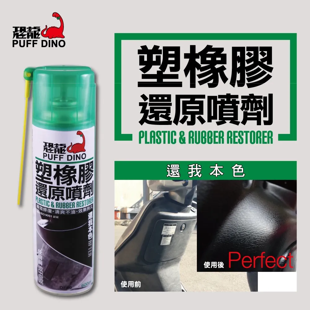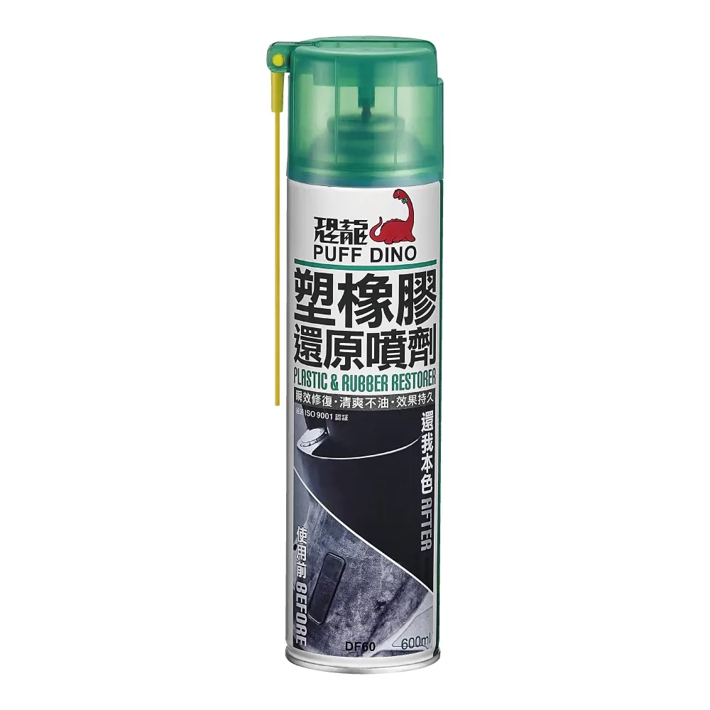 恐龍塑橡膠還原噴劑,立即修復車輛老化的塑膠及橡膠部件,還原其亮麗的光澤。並形成具有撥水、抗污的保護膜。施工簡易方便,膜層清爽不油膩,不會弄髒衣物及沾附塵土。用於橡膠部件可預防老化,抗UV,保持橡膠表面的彈性與光澤。