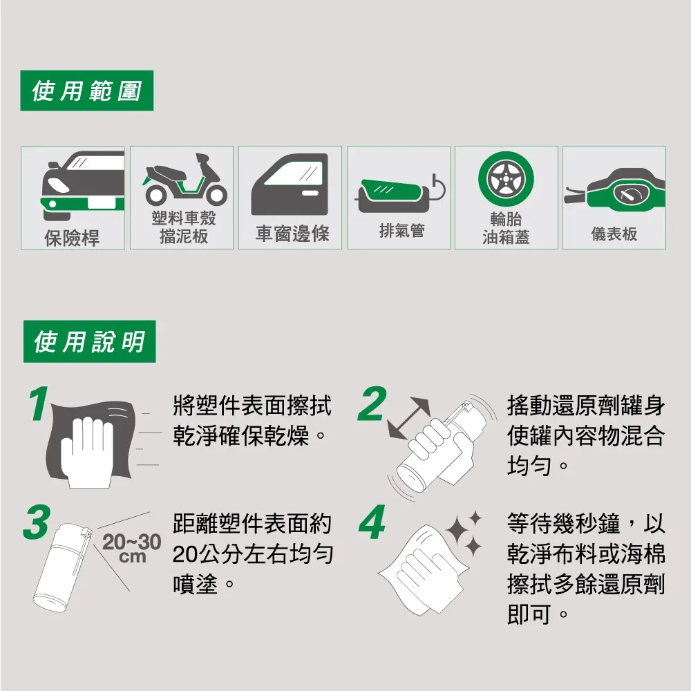 ◆瞬效修復:噴塗之後立即修復老化的塑橡膠物件。