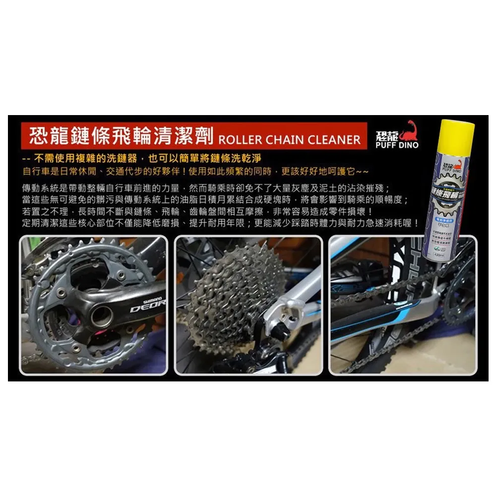 ✅腳踏車鏈條因長時間暴露在沙塵下會造成齒輪與鏈條的磨損。使用恐龍鏈條清潔劑,能有效去除鏈條及飛輪的上砂石與油污,增加鏈條性能,延長鏈條使用期限。