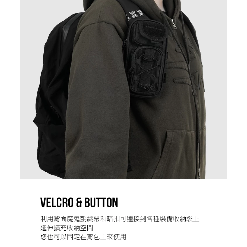 🔹背面魔鬼氈織帶和暗扣可連接到各種裝備收納袋上,延伸擴充收納空間