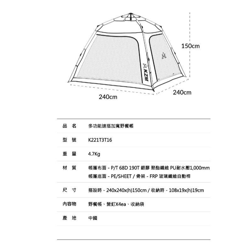 尺寸:搭設時 - 240x240x(h)150cm / 收納時-108x(h)19cm