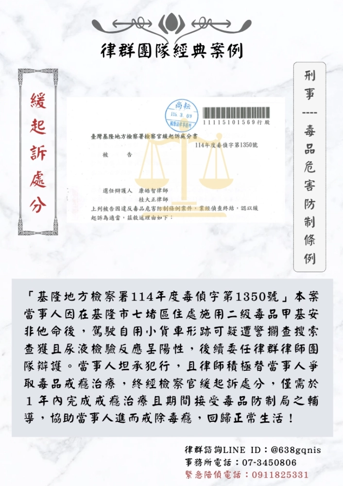 「基隆地方檢察署114年度毒偵字第1350號」本案當事人因在基隆市七堵區住處施用二級毒品甲基安非他命後,駕駛自用小貨車形跡可疑遭警攔查搜索查獲且尿液檢驗反應呈陽性,後續委任律群律師團隊辯護。當事人坦承犯行,且律師積極替當事人爭取毒品戒癮治療,終經檢察官緩起訴處分,僅需於1年內完成戒癮治療且期間接受毒品防制局之輔導,協助當事人進而戒除毒癮,回歸正常生活!