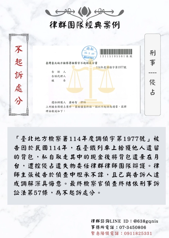 「臺北地方檢察署114年度調偵字第1977號」被告因於民國114年,在臺鐵列車上拾獲他人遺留的背包,私自取走其中的現金後將背包遺棄在月台,遭控侵占遺失物。律師主張被告於偵查中坦承不諱,且已與告訴人達成調解深具悔意。最終檢察官偵查終結依刑事訴訟法第57條,為不起訴處分。