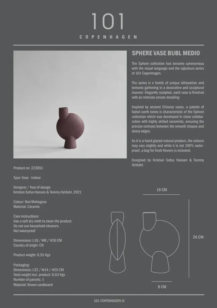 Sphere 系列已成為 101 Copenhagen 標誌性的設計語彙與代表作品。此系列集合了多種獨特的輪廓與質地,以裝飾和雕塑感的方式呈現。每個花瓶都經過精美的雕刻,並帶有細緻精巧的裝飾細節。受古代中國花瓶的啟發,Sphere系列的特色是褪色的大地色調。該系列是在與經驗豐富的陶藝師密切合作下開發而成,確保每件作品在柔和造型與銳利稜角之間取得完美對比。