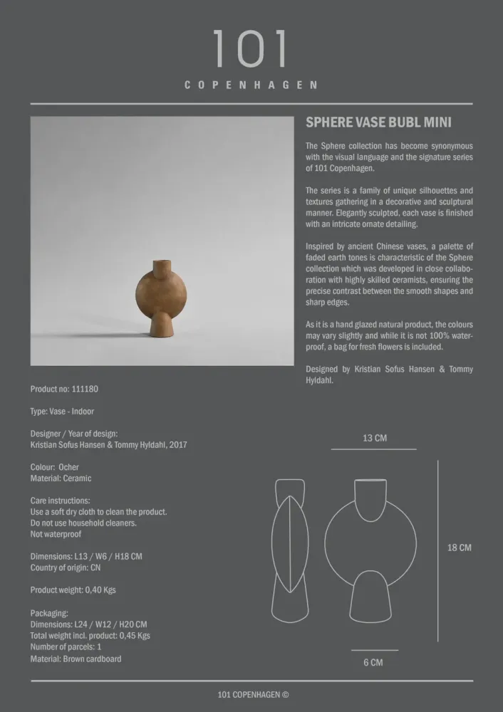 Sphere 系列已成為 101 Copenhagen 標誌性的設計語彙與代表作品。此系列集合了多種獨特的輪廓與質地,以裝飾和雕塑感的方式呈現。每個花瓶都經過精美的雕刻,並帶有細緻精巧的裝飾細節。受古代中國花瓶的啟發,Sphere系列的特色是褪色的大地色調。該系列是在與經驗豐富的陶藝師密切合作下開發而成,確保每件作品在柔和造型與銳利稜角之間取得完美對比。