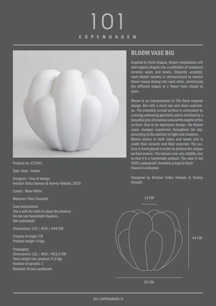 Bloom 有花瓶和托盤兩種形式,由陶瓷和纖維混凝土製成。表面經過手工上釉,呈現獨特的表面紋理。