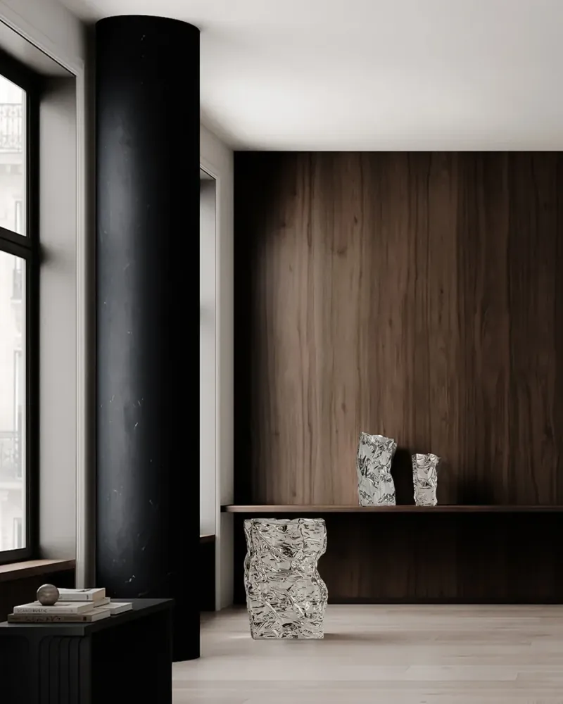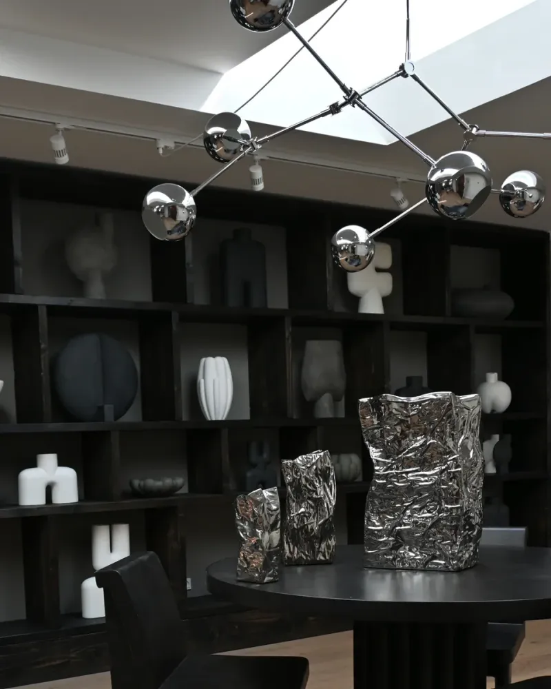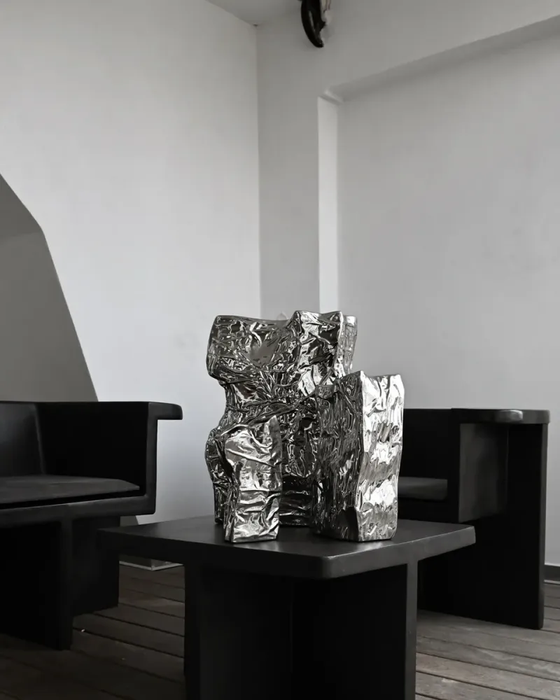 有三種尺寸及兩種顏色:骨白色強調皺摺紙袋效果,鉻色則帶來鏡面般的現代感。表面經過手工上釉,內部防水塗層確保其100%防水,可用於擺放鮮花。