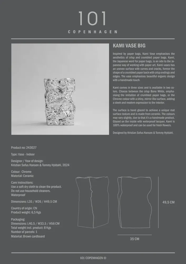 靈感來自紙袋的設計,強調了皺摺紙袋的美學。Kami 是日文中的“紙袋”之意,致敬日本的紙藝工藝。花瓶表面不規則,呈現出皺摺的效果,強調有機設計和手工質感。
