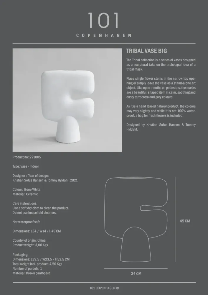 Tribal 系列是一系列花瓶,是以部落族群面具為雛形概念的雕塑設計品,可作為花瓶投擲花朵或純粹作為藝術品。它就像一個張開嘴巴的面具托於圓體底座上。是一件造型優美的物品,採用平靜、舒緩和塵土飛揚的赤陶色和灰色製作而成。