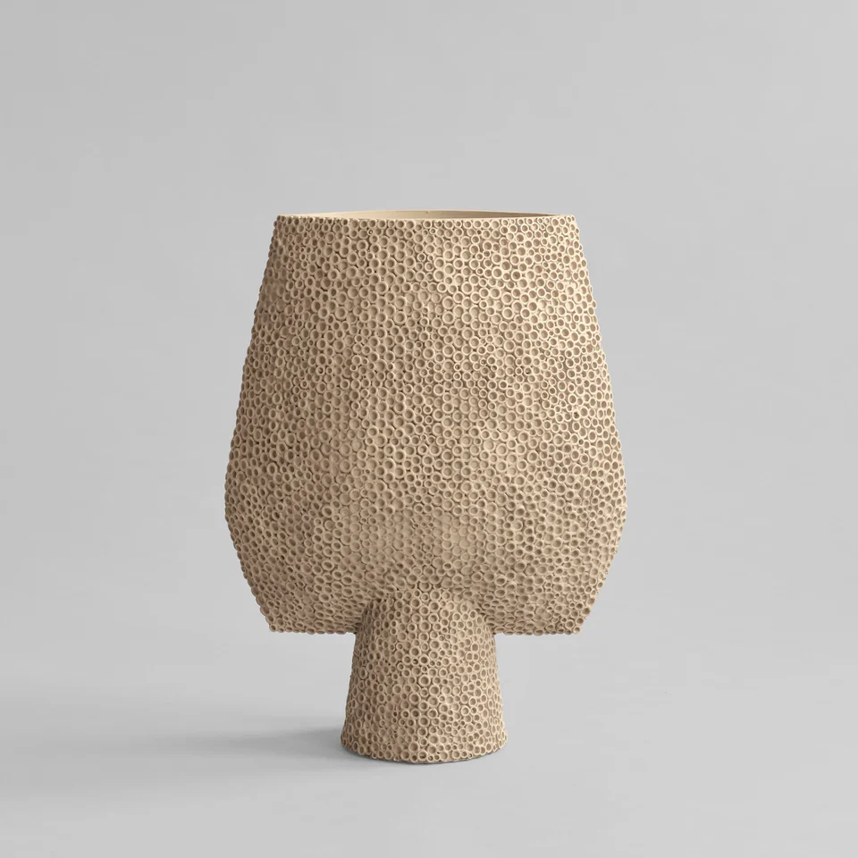 Sphere 系列帶有獨特的輪廓和紋理,雕刻優雅,每個花瓶都飾有複雜華麗的細節。以裝飾和雕塑的方式聚集在一起。現已成為 101 Copenhagen 的鮮明視覺標誌了。受中國古代花瓶的啟發,褪色的大地色調是 Sphere 系列的特色,光滑的形狀和鋒利的邊緣之間精確的比例及對比是與技藝精湛的陶藝師密切研創製成的作品。