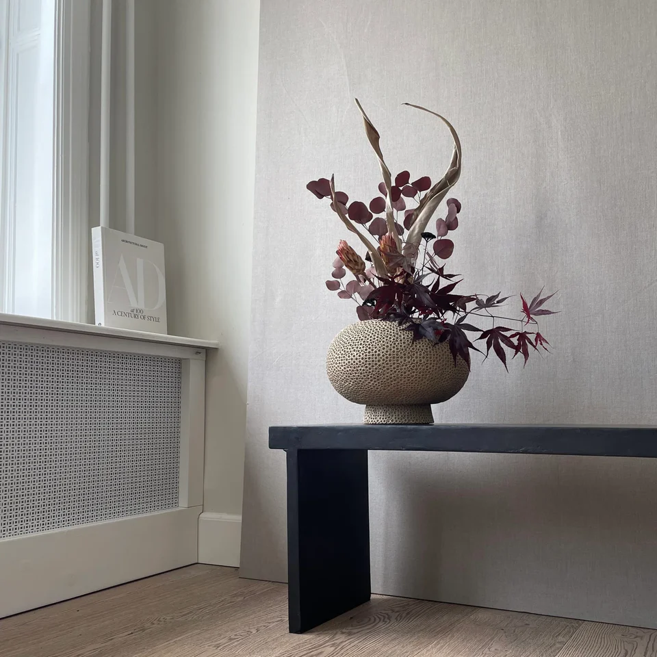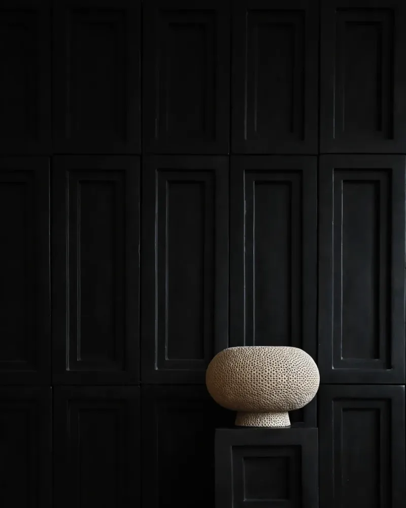 Kabin系列花瓶靈感來自日本工藝中的經典簡約造型,結合了斯堪的納維亞風格,展現出極簡的設計美學。Shisen款的新設計以數百個小圓點組成的網紋效果為特色,表面具有獨特的觸感。「Shisen」在日文中意為網狀或視角,體現了花瓶的細膩結構與藝術表達。
