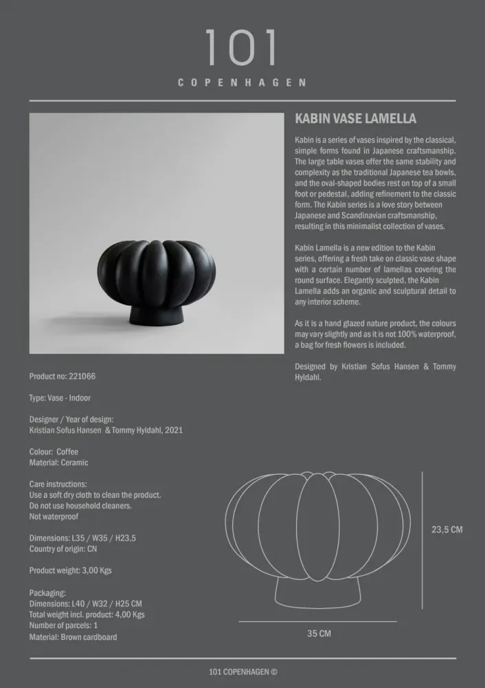 Kabin系列花瓶以日本工藝的經典簡約形式為靈感,結合斯堪的納維亞設計,呈現極簡主義風格。圓潤的表面覆蓋多層片狀結構,賦予花瓶有機且雕塑感的細節,適合提升室內空間的設計層次。