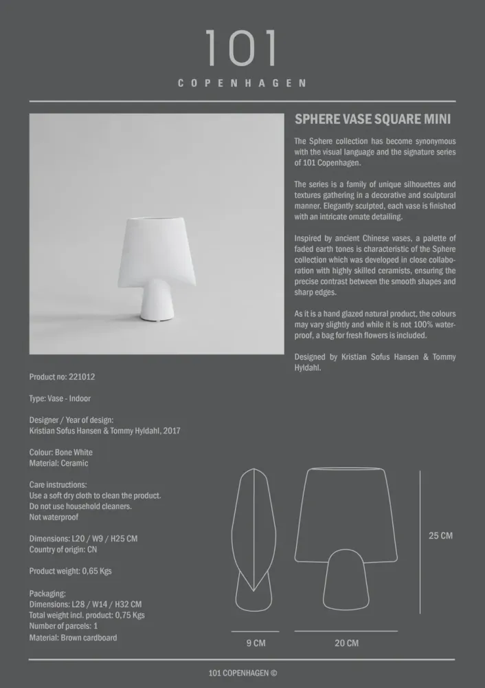 Sphere 系列帶有獨特的輪廓和紋理,雕刻優雅,每個花瓶都飾有複雜華麗的細節。以裝飾和雕塑的方式聚集在一起。現已成為 101 Copenhagen 的鮮明視覺標誌了。受中國古代花瓶的啟發,褪色的大地色調是 Sphere 系列的特色,光滑的形狀和鋒利的邊緣之間精確的比例及對比是與技藝精湛的陶藝師密切研創製成的作品。