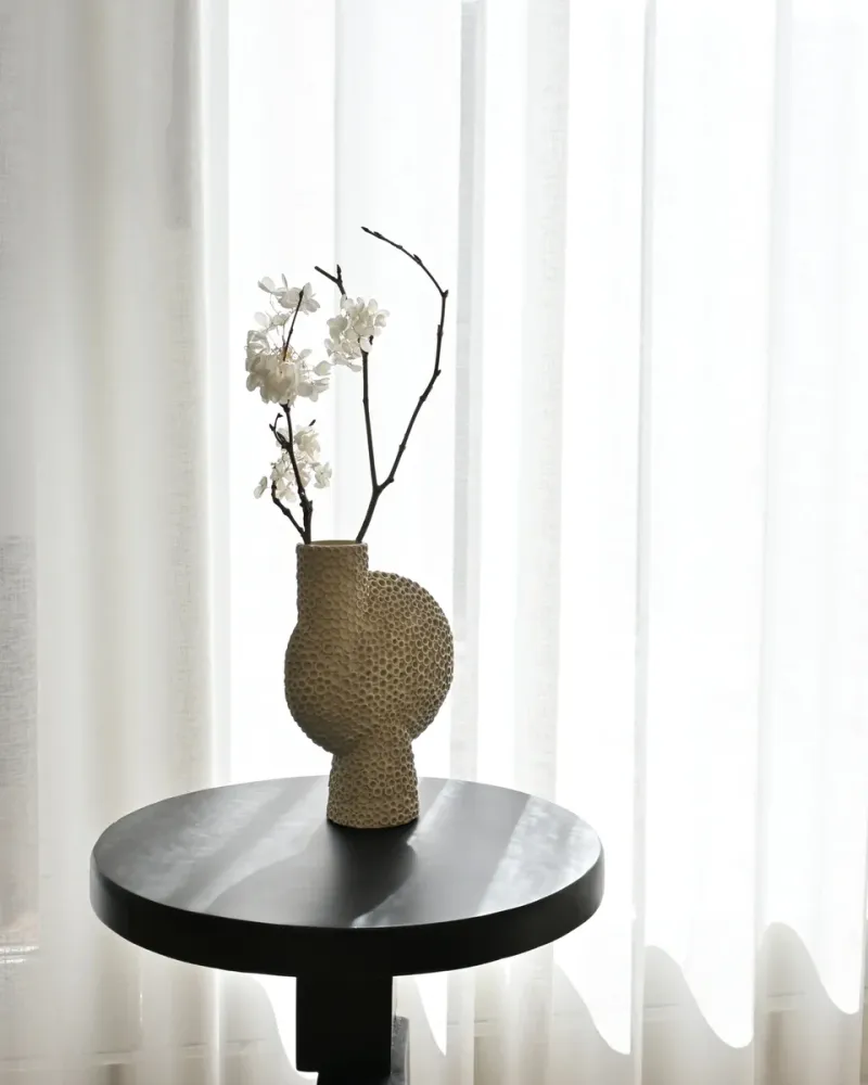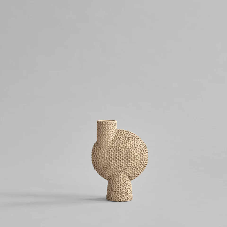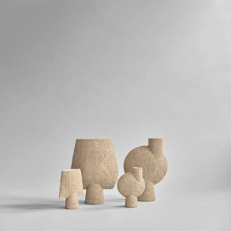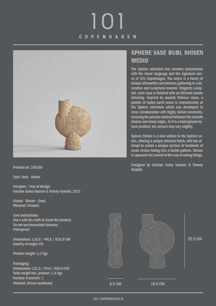 Sphere 系列帶有獨特的輪廓和紋理,雕刻優雅,每個花瓶都飾有複雜華麗的細節。以裝飾和雕塑的方式聚集在一起。現已成為 101 Copenhagen 的鮮明視覺標誌了。受中國古代花瓶的啟發,褪色的大地色調是 Sphere 系列的特色,光滑的形狀和鋒利的邊緣之間精確的比例及對比是與技藝精湛的陶藝師密切研創製成的作品。