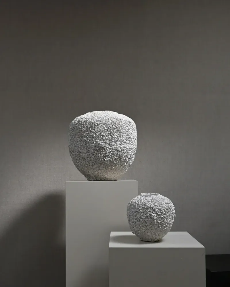 花器以陶瓷製成,採用海灘貝殼翻模打造,手工施釉呈現獨特霧面質感。內部採用防水塗層,可用於擺放鮮花。