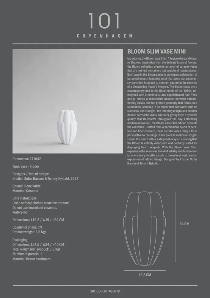 Bloom Vase Slim是對該系列的延伸,採用陶瓷與纖維混凝土的融合,呈現纖細的設計,為系列帶來嶄新視角。