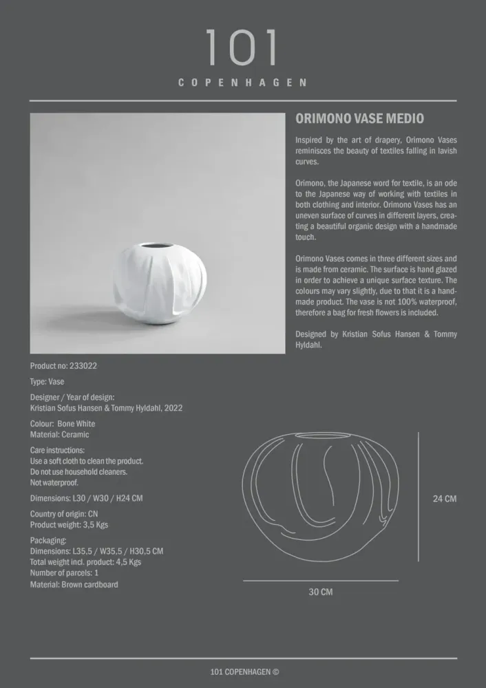 「Orimono」在日語中意為「織物」,向日本在服裝與室內設計中精湛的織物工藝致敬。花瓶表面不規則的曲線層次,呈現有機且充滿手工感的設計之美。