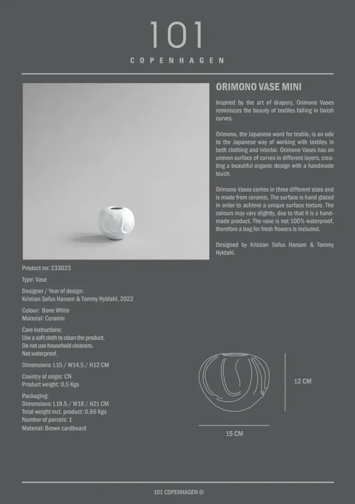 「Orimono」在日語中意為「織物」,向日本在服裝與室內設計中精湛的織物工藝致敬。花瓶表面不規則的曲線層次,呈現有機且充滿手工感的設計之美。