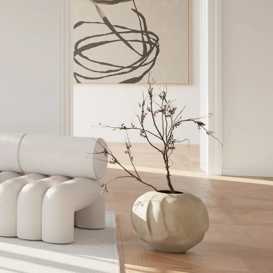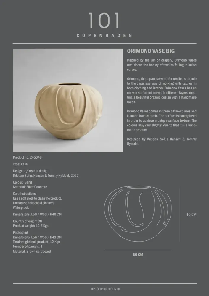 「Orimono」在日語中意為「織物」,向日本在服裝與室內設計中精湛的織物工藝致敬。花瓶表面不規則的曲線層次,呈現有機且充滿手工感的設計之美。