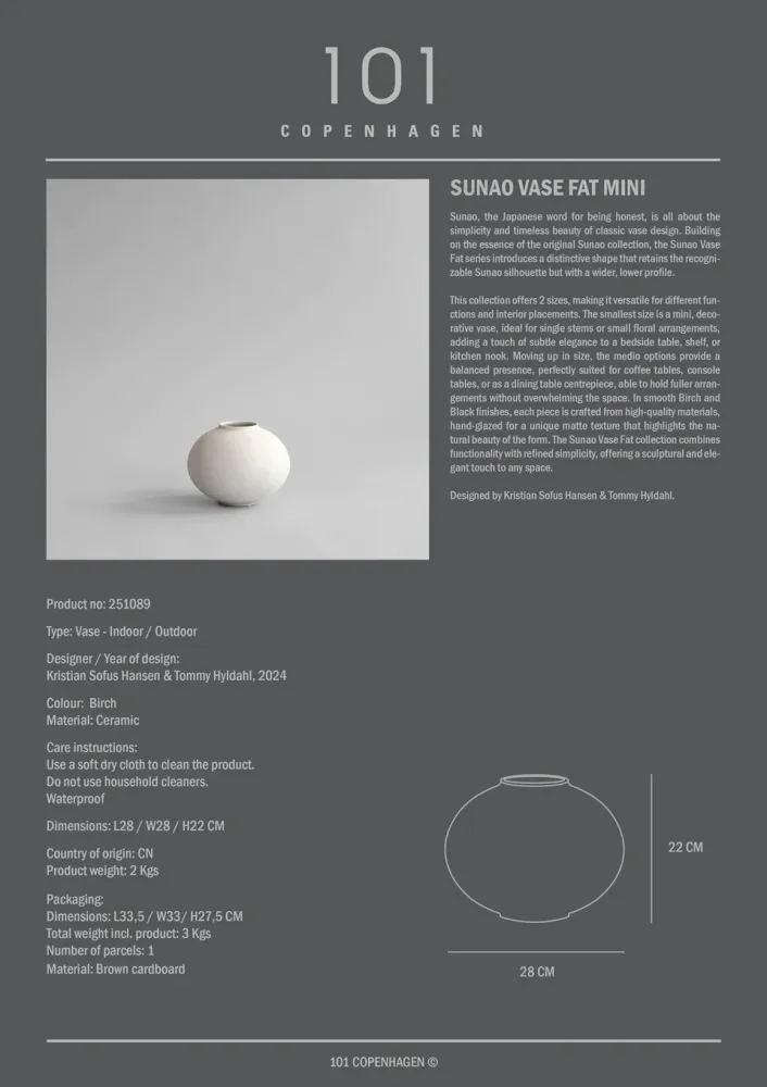 「素直」,源自日語,意為「純粹、誠實」,Sunao胖型花瓶延續了原始系列的標誌性輪廓,並以更寬、更矮的比例呈現,使其更具穩重感與雕塑感。