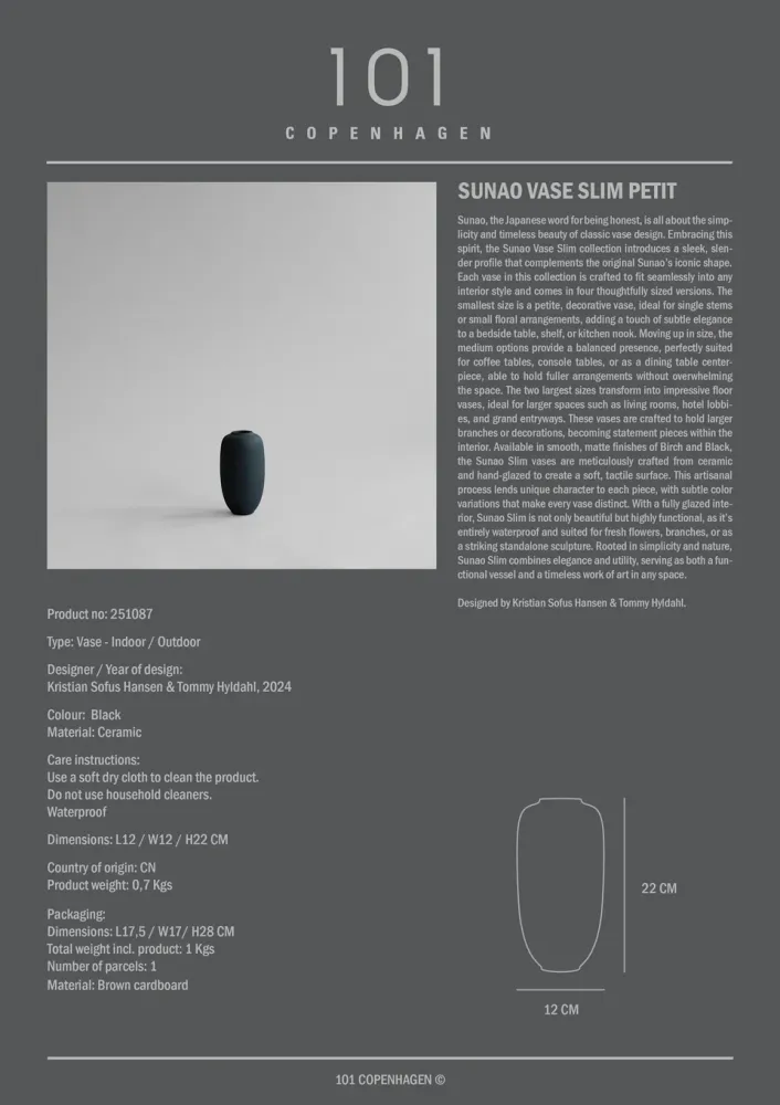 「素直」,源自日語,意為「純粹、誠實」,Sunao Vase Slim系列承襲經典設計,並以細長輪廓帶來優雅新意,完美融入多種空間風格。