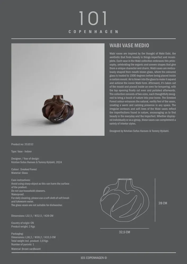 此系列有兩種尺寸,每款都精心設計,將大自然的氣息帶入家居。煙霧森林色增強了花瓶自然、土壤般的感覺,營造出溫暖與寧靜的氛圍。不規則輪廓與柔和線條反映了自然界中的不完美,提醒我們在日常生活中尋找美的存在,單獨展示或組合陳列皆宜。