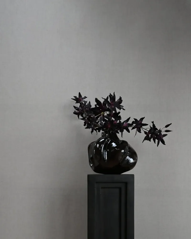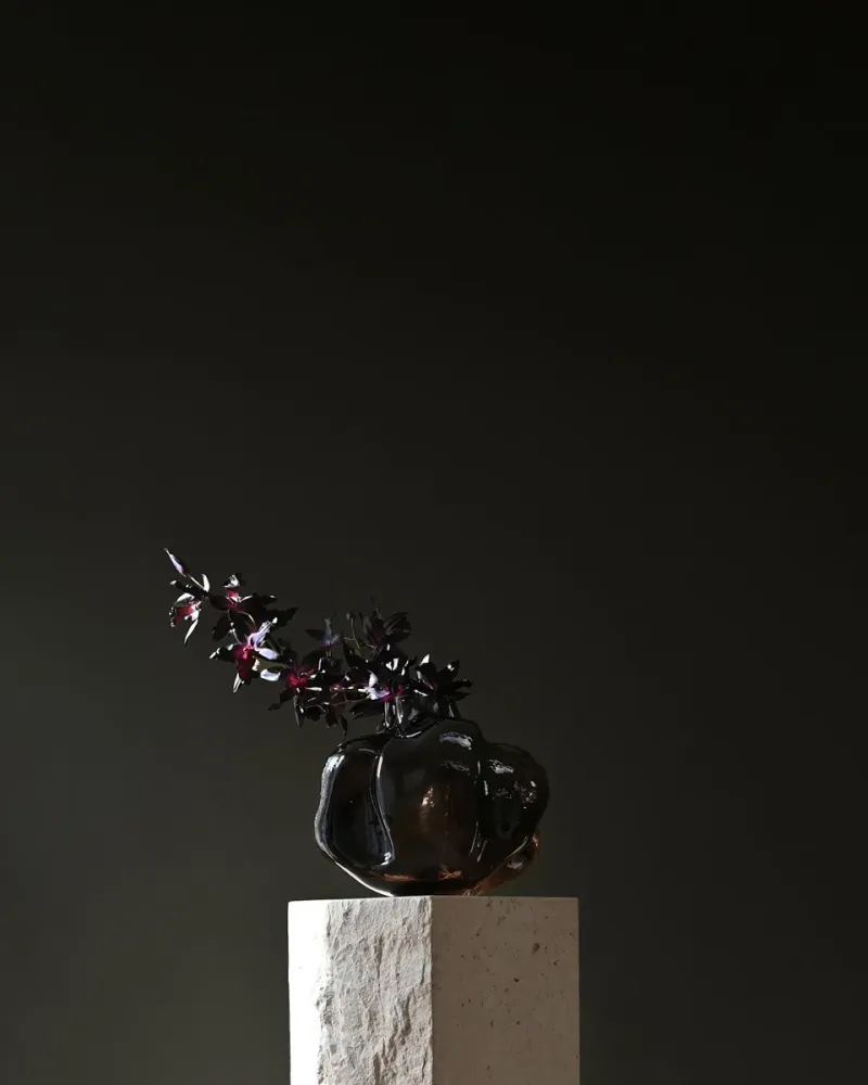 設計靈感源於侘寂美學,崇尚不完美和未完成之美,展現自然有機的不規則形狀,充滿獨特魅力。花瓶由手工吹製玻璃精心打造,玻璃在 1500 度高溫下熔化後,放入專屬模具中塑形,透過吹氣讓玻璃膨脹並形成標誌性造型。成型後,玻璃從模具取出並放入烤箱進行回火處理,頂部開口經修整並拋光,最後進行噴塗處理,呈現標誌性色彩。