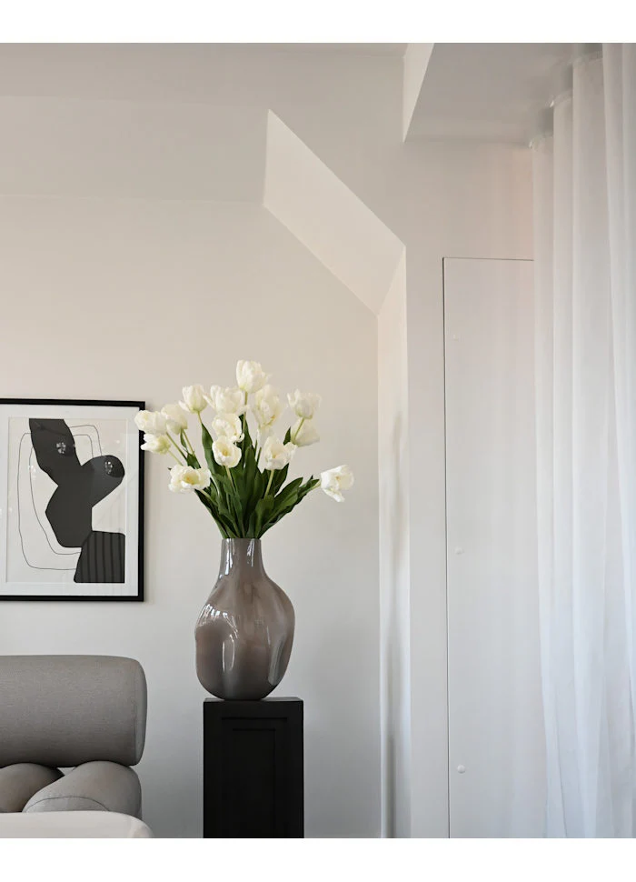由於採用純手工工藝,每一只 Bakku 花瓶皆獨一無二;小小的氣泡或形狀上的細微差異,正是其獨特之處。系列提供兩種尺寸:小款花瓶適合精緻的餐桌花藝,或作為玄關、茶几上的雅緻點綴;而大款花瓶則能成為空間中的視覺焦點,不論是搭配鮮豔花材、雕塑感枝條,或是單獨陳列,都展現出醒目的玻璃藝術風采。