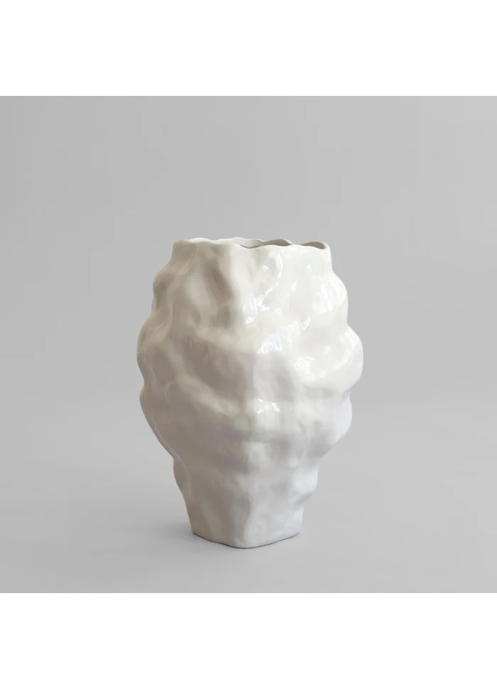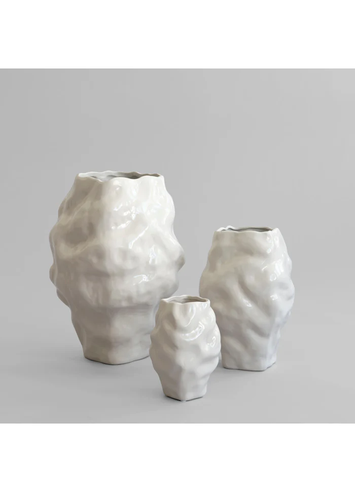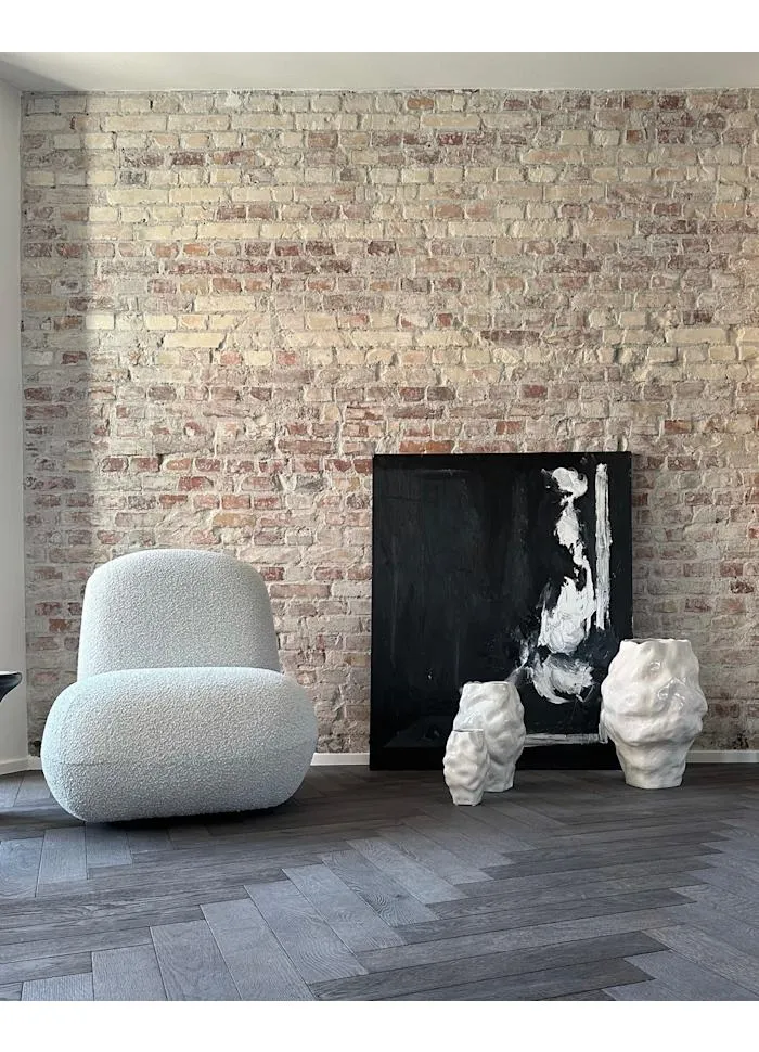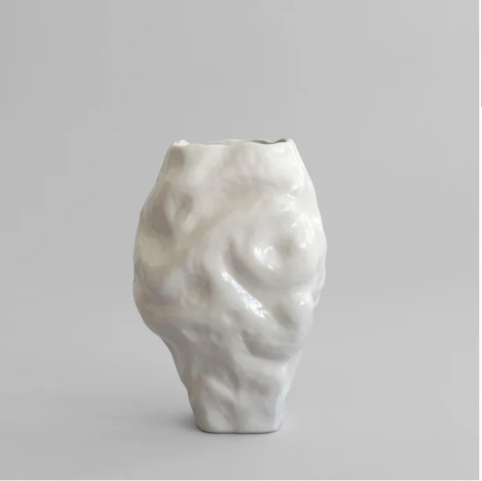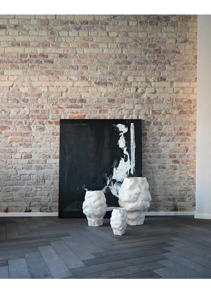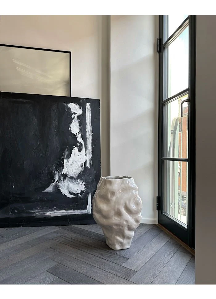 花瓶採用 高光澤陶瓷釉面,能如流動的鏡面般映照周圍環境,進一步強化光與質感的交織。光滑的釉面與粗獷不規則的造型形成鮮明對比,使每一件作品都同時展現出精緻與雕塑感。
